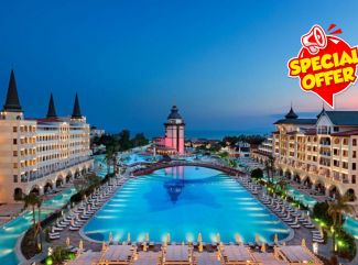 Намира се на 15 км. от летището, на 25 км. от центъра на Анталия, на брега на морето. Построен e през 2009 г. Стаи: Хотелът разполага с 546 стаи. Всички стаи са оборудвани с: централен климатик, сешоар, душ, телевизор, телефон, мини бар (безалкохолни и алкохолни напитки, зареждат се ежедневно, безплатно), сейф (безплатно), безжичен интернет, балкон или тераса. Почистване на стаята – ежедневно, смяна на спалното бельо – ежедневно. В хотела: Основен ресторант, диетична храна, вегетарианска храна, 7 ресторанта а - ла - карт: японски, рибен (с предварителна резервация, платено) руски, турски, средиземноморски, тайландски, ресторант Brasserie - традиционна френска и американска кухня, с предварителна резервация с такса), 11 бара (един от които работи 24 часа), 2 открити басейна (един с морска вода във формата на подводен риф (Swim Reef) с екзотични риби, платено), 2 закрити басейна (един с морска вода, платено), кино, лекарски кабинет, SPA & Thalasso-център, фризьор, магазини, пералня, химическо чистене, 2 банкетни зали, 17 конферентни зали, бизнес център. За децата: детски басейн, мини клуб, бавачка(заплаща се допълнително). Безплатни услуги: турска баня, руска баня, сауна, парна баня, джакузи, фитнес, аеробика, аква аеробика, волейбол, плажен волейбол, баскетбол, скуош, 2 тенис корта, тенис на маса, анимационна програма, музика на живо. Платени услуги: масаж, боулинг (4 пътеки), наем на тенис ракети и топки, осветление на тенис кортовете, уроци по тенис, водни спортове, курс по гмуркане. Хранене: ULTRA ALL INCLUSIVE - закуска, обяд и вечеря на шведска маса, междинни хранения, алкохолни и безалкохолни напитки - без лимит (съгласно концепцията на хотела). Плаж: Собствен, пясъчен плаж. Бар на плажа: безплатно. На басейна и на плажа: чадъри, шезлонги, матраци - безплатно. Плажни кърпи - безплатно. Хотелът има право да прави промени в концепцията, без да уведомява предварително туроператора за наложените промени. |