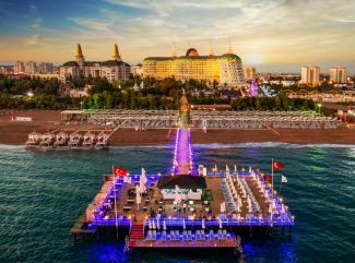 Новогодишна вечеря на 31.12.2025 Местата за Новогодишната вечеря на 31.12.2025 са изчерпани. За резервации направени след 05.10.2025 ще има стандартна вечеря в основния ресторант. Всеки хотел определя индивидуално цените, условията, начина на сервиз и забавленията на новогодишната нощ. Местоположение: Намира се на 15 км. от летище Анталия, на 10 км. от центъра на Анталия, в района на Лара, на брега на морето. Посторен през 2012 г., с обща площ 54.000 м2., реновиран 2014 г. Стаи: Хотелът разполага с общо 650 стаи, разположени в една 9-етажна сграда, от които 474 супериор стаи Superior room (с изглед суша, частично море – 35 м2). 38 фамилни стаи Family room (с изглед частично море, 2 спални - 56 м2); 43 Connection rooms (с изглед частично море, 2 спални, 2 бани, 70 м2); 64 Junior suite ( едностаен апартамент, с изглед частично море - 45 м2); 21 Lagoon room (с директен достъп до общ басейн - 36 м2). 9 Deluxe family room (с изглед частично море, 2 спални – 56 м2). Всички стаи са оборудвани с климатик, телевизор, телефон, баня с душ/вана, сешоар, минибар (безплатен), сет за кафе/чай, сейф (безплатен). Почистване на стаите и смяна на кърпите - всеки ден, смяна на спалното бельо – 2 пъти в седмицата. В хотела: Основен ресторант, 8 а - ла - карт ресторанта (италиански, френски, гръцки, мексикански, далекоизточен, османски, рибен, ресторант месо и вино - с предварителна резервация, при минимум 7 нощувки - безплатно), 5 бара, 3 открити (оновен, релакс и с пързалки) и 1 закрит басейн, дискотека, аквапарк, лунапарк, СПА център, магазини, конферентна зала, Wi-Fi (безплатен). За децата: Детски открит и закрит басейн, водни пързалки, детска площадка, мини клуб (4-12г.), мини диско, детски приключенски парк, детегледачка (платено). Безплатни услуги: Сауна, турска баня, парна баня, тенис на маса, тенис корт, фитнес, дартс, аеробика, степ, водна гимнастика, кино, жива музика, анимация. Платени услуги: Масаж, пилинг, джакузи, фризьорски и козметичен салон, уроци по тенис, осветление за тенис корт, зала за игри, боулинг, билярд, компютърни игри, химическо чистене, лекар, водни спортове, интернет-кафе, рент - а кар. Хранене: ULTRA ALL INCLUSIVE - закуска, обяд и вечеря, междинни хранения, алкохолни и безалкохолни напитки - без лимит (съгласно концепцията на хотела). Плаж: Собствен, пясъчен. Чадъри, шезлонги и матраци на плажа и при басейна - безплатно. Плажни кърпи – безплатно. Хотелът има право да прави промени в концепцията, без да уведомява предварително туроператора за наложените промени. |