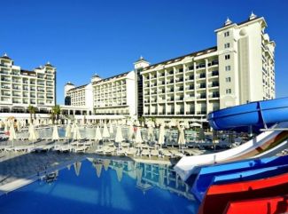 Според критериите на Туроператора, хотелът не покрива условията на официалната си категория 5 звезди и затова е обявен като категория 4 звезди. Хотелът се намира на 65 км. от летище Анталия, на 70 км. от Анталия, на 7 км. от Сиде, на 5 км. от Манавгат, на 750 м. от брега на морето. Построен през 2012 г. с обща площ от 25 00кв.м. Стаи: Хотелът разполага с общо 418 стаи . Всички стаи са оборудвани с: климатик, телевизор, телефон, баня с душ, сешоар, минибар, сейф /безплатен/, балкон, Wi-Fi интернет /платен/. Почистване на стаите – всеки ден, смяна на бельото и кърпите – 3 пъти в седмицата. В хотела: Основен ресторант, 3 а-ла карт ресторанта с предварителна резервация), 3 бара, открит басейн, закрит басейн, фитнес център, амфитеатър, дискотека, магазини, За децата: детски басейн, мини клуб. Безплатни услуги: турска баня, сауна, парна баня, фитнес, тенис на маса, аеробика, водна топка, дартс, плажен волейбол, софт анимация, жива музика, Wi-Fi интернет на лоби /безплатен/. Платени услуги: фризьор, химическо чистене, детегледачка, водни спортове. Хранене: Ultra All inclusive – закуска, обяд, вечеря, междинни хранения на шведска маса, алкохолни и безалкохолни напитки местно производство( 24 ч.) без лимит. Плаж: Плаж: Чадъри, шезлонги и плажни кърпи- безплатно Хотелът има право да прави промени в концепцията, без да уведомява предварително туроператора за наложените промени. |