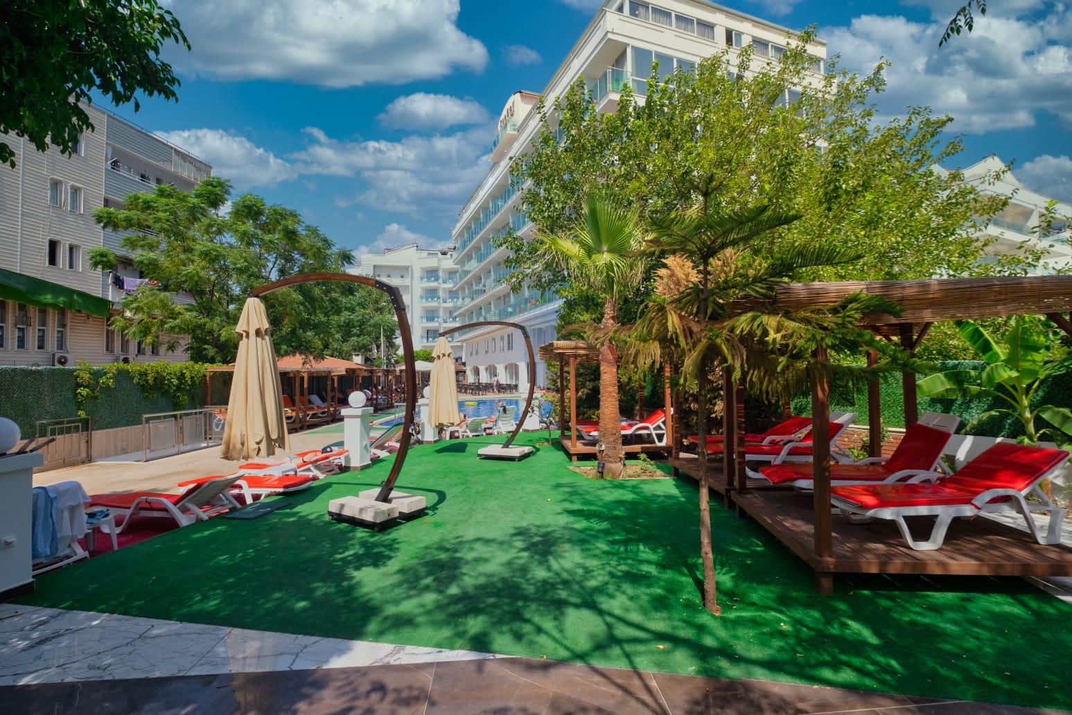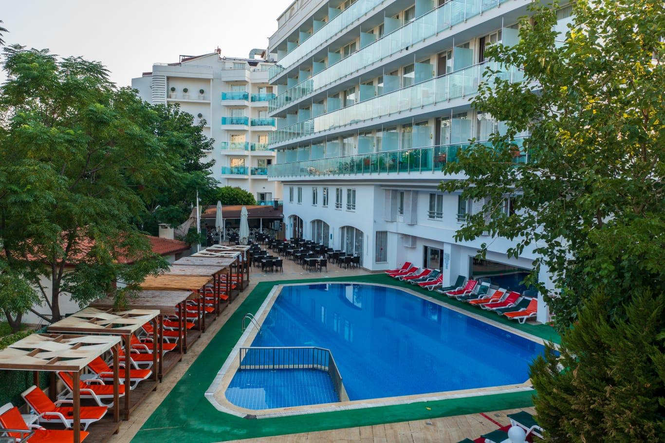Намира се на 2 км от центъра на Мармарис , на 6 км от Ичмелер , на 90 км от летище Даламан , на 150 км от летище Милас. Последно реновиран през 2016г. Стаи: Хотелът разполага с 68 стандартни стаи 20 m2. Всички стаи са оборудвани с климатик, телевизор, телефон, баня с душ, сешоар, балкон/тераса, мини бар (срещу заплащане) , сейф (срещу заплащане на рецепция) . Почистване на стаите – всеки ден, смяна на спалното бельо – 3 пъти в седмицата. В хотела: Основен ресторант , бар , 2 басейна , За децата: 1 детски басейн Безплатни услуги : лека анимация , бинго , дартс , фитнес , тенис на маса , турска баня Платени услуги: СПА център, сауна,водни спортове, салон за красота Хранене: All Inclusive - закуска, обяд и вечеря на шведска маса, междинни хранения, местни алкохолни и безалкохолни напитки - без лимит (съгласно концепцията на хотела). Плаж: Чадъри, шезлонги, матраци и плажни кърпи на плажа и при басейна - безплатно. |