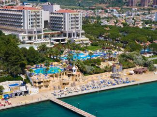 Намира се на 65 км от летище Измир, на 175 км от летище Милас, на 5 км от центъра на Кушадасъ, на брега на морето. Построен 1989 г., с обща площ 6000 м², последно реновиран 2004 г. Стаи: Хотелът разполага с общо 333 стаи, от които 272 Standard Room ( 3 от тях подходящи за хора с намалена подвижност, 29 м²), 1 Honeymoon suite, 46 Large Room (30 м²), 6 Junior Suites (спалня, хол, 49 м²), 8 Senior Suites (спалня, хол, 60 м²). Всички стаи са оборудвани с климатик, телевизор, телефон, баня с вана, сешоар, минибар (платен), сейф (безплатен), балкон. В хотела: Основен ресторант, 3 а-ла-карт ресторанта (рибен, турски и италиански ресторант - 1 безплатно посещение на 1 от ресторантите при минимум 7 нощувки, с предварителна резервация), 5 бара, 2 открити басейна, 1 закрит отопляем басейн, магазини, СПА център, амфитеатър, дискотека, паркинг. За децата: детски басейн, детска площадка,мини клуб. Безплатни услуги: Турска баня, сауна, фитнес, дартс, тенис на маса, тенис корт, плажен волейбол, аеробика, водна гимнастика, билярд, анимация, Wi-Fi в общи площи. Платени услуги: телефон, масаж, фризьор, магазини, видеоигри, интернет кафе, химическо чистене и пране, лекар, детегледачка, осветление за тенис корта, билярд, моторни водни спортове, уроци по гмуркане, минибар в стаите, Wi-Fi интернет в стаите. Хранене: All Inclusive – закуска, обяд и вечеря на шведска маса, допълнителни хранения, местни алкохолни и безалкохолни напитки без лимит (съгласно концепцията на хотела). Плаж: Платформа с дължина 150 м. и ширина 20 м. Чадъри, шезлонги, матраци и плажни кърпи на плажа и при басейна - безплатно. *Хотелът има право да прави промени в концепцията си по всяко време, без да уведомява предварително туроператора. |