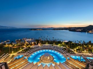 Хотелът се намира на 60 км. от летище Милас, на 25 км. от центъра на Бодрум, в района на Тургутрейс, на брега на морето с панорамна гледка към Егейско море. Разполага с обща площ от 50 000 m². Стаи: Хотелът разполага с 384 стаи, от които 152 стандартни и 120 фамилни. 95 % от всички стаи са с изглед към морето. Всички стаи са оборудвани с климатик, сателитна телевизия, телефон, баня с душ/вана, сешоар, мини бар (безплатен), сет за кафе и чай, сейф (безплатен), балкон, Wi-Fi (безплатен). Почистване на стаите - всеки ден, смяна са бельото и кърпите 3 пъти в седмицата. В хотела: Основен ресторант, 4 а - ла - карт ресторанта (с предварителна резервация; минимум 5 нощувки; турски, морски, китайски и италиански), 8 бара, дискотека, сладкарница, 3 открити и 1 закрит басейн, водни пързалки, аквапарк, амфитеатър, магазини, СПА център, конферентни зали, паркинг, библиотека, кино, анимация. За децата: Детско меню, детски басейн, аквапарк с 5 водни пързалки, детска площадка, бейби клуб (1- 3 г.), мини клуб (4–12 год.), джуниър клуб (13-16 год.), детски ресторант. Безплатни услуги: фитнес, тенис на корт, футбол, скуош и оборудване, плажен волейбол, баскетбол, безмоторни водни спортове, уиндсърф, колела, турска баня, сауна, парна баня, джакузи, леден фонтан, тенис на маса, дартс, билярд през деня, кино, жива музика, анимация, паркинг, WI-FI. Платени услуги: светлини за тенис корт и футбол игрище, електронни игри, билярд, масажи, СПА процедури, телефон, фотограф, магазини и бутици, румсървис, детегледачка, наргиле. Хранене: ULTRA ALL INCLUSIVE – закуска, обяд, вечеря и междинни хранения на шведска маса; местни и някои вносни алкохолни и безалкохолни напитки - без лимит. Плаж: Собствен, пясъчен и платформа - чадъри и шезлонги на плажа и при басейна – безплатно. Хотелът има право да прави промени в концепцията, без да уведомява предварително туроператора за наложените промени. |