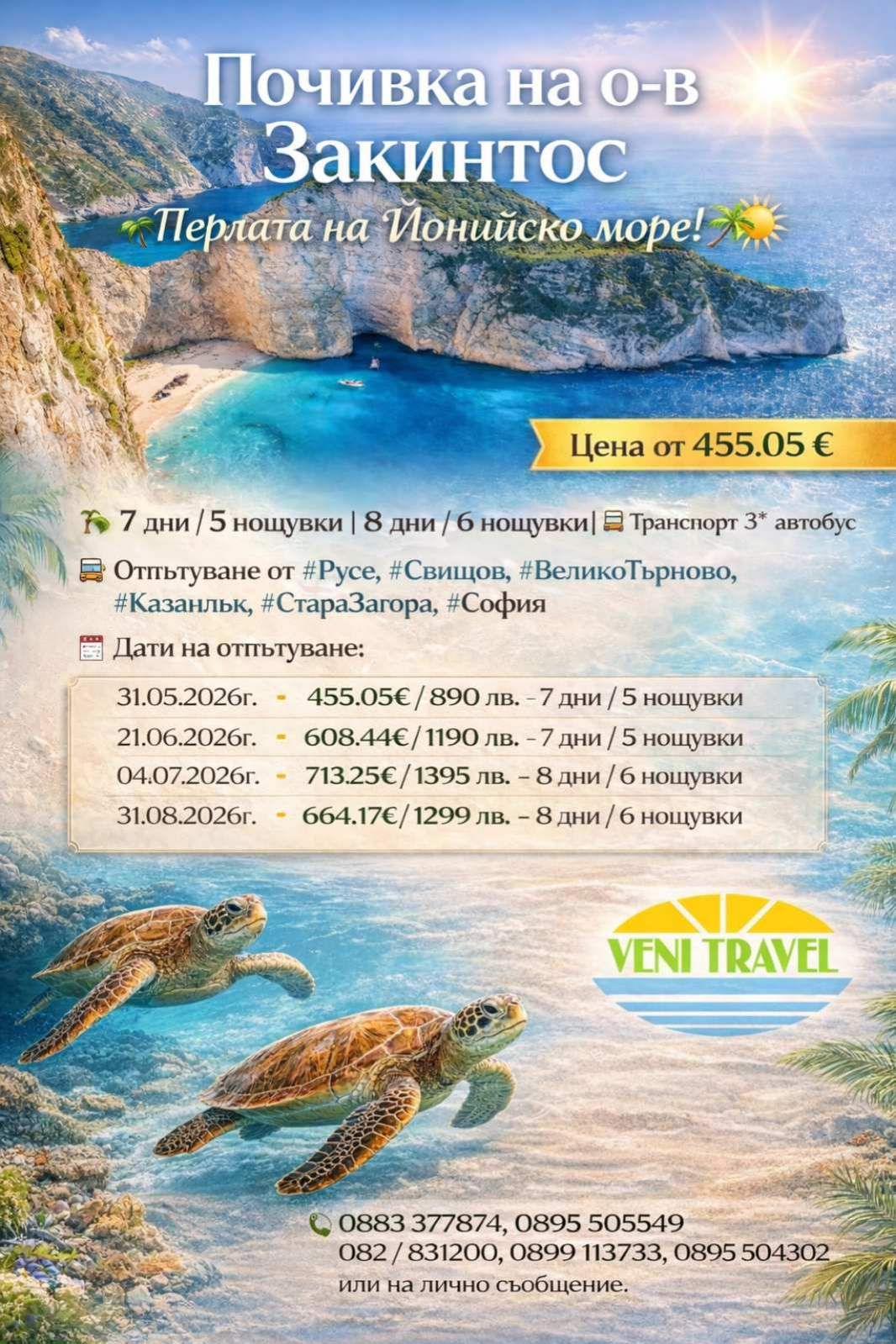 • панорамна обиколка на о-в Закинтос – при минимум 20 туриста-25.56 €/50.00 лв. за възрастен и 15.34€/30.00 лв. за деца до 11.99 год.