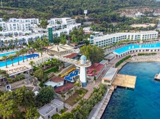 Намира се на 23 км от летище Бодрум, на 10 км от центъра на Бодрум, в района на Торба, на брега на морето. Построен 1996 г., на обща площ от 55 000 м².Основна реновация 2015. Частично реновиран 2022 г. Стаи: Хотелът разполага с общо 341 стаи, от които 217 Club Rooom разположени в 2-етажни къщички и Deluxe Room в основна сграда. Стаи Club Room (спалня, баня, изглед суша - 20 м²), Club Room Sea View (спалня, баня,с изглед море - 20 м²), Family Club Room Land View (2 спални,1 баня, с изглед суша - 35 м²), Deluxe Room Sea View (спалня, баня, с изглед море - 35-40 м²), Deluxe Family Room Sea View (2 спални, 1 баня, с изглед море - 55 м²). Всички стаи са оборудвани с климатик, телевизор, телефон, баня с душ, сешоар, сет за чай/кафе, минибар (безплатен). Почистване на стаите и смяна на кърпите – всеки ден, смяна на спалното бельо – 2 пъти в седмицата. В хотела: Основен ресторант, 3 а-ла-карт ресторанта (рибен - 1 безплатно посещение при минимум 7 нощувки, турски, италиански - срещу заплащане), сладкарница, 6 бара, 3 открити и 2 закрит басейн, аквапарк, амфитеатър, СПА център, дискотека, магазини, паркинг. За децата: 2 детски басейна, мини аквапарк, детска площадка, мини клуб (4-12г), детска анимация. Безплатни услуги: Сауна, турска баня, дартс, шах, аеробика, пилатес, водна гимнастика, жива музика, анимация, Wi-Fi (в общи площи). Платени услуги: Масаж, пилинг, фризьор, фотограф, лекар, детегледачка, химическо чистене, боулинг, билярд, водни спортове, плажна кабана, рент-а-кар. Хранене: Ultra All Inclusive - закуска, обяд и вечеря на шведска маса, междинни хранения, алкохолни и безалкохолни напитки - без лимит (съгласно концепцията на хотела). Плаж: Собствен, пясъчен, платформа. Чадъри, шезлонги и плажни кърпи на плажа и при басейна – безплатно. Хотелът има право да прави промени в концепцията, без да уведомява предварително туроператора за наложените промени. |