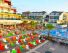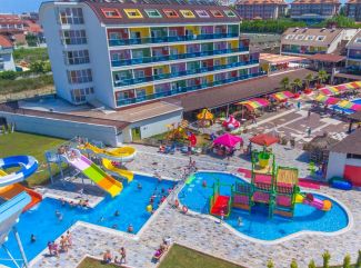 На около 50 км. от летището в Анталия и на 7 км. от Сиде. Стаи Всички стаи са с балкон, климатизация, сателитна телевизия, минибар с вода. Плаж Пясъчен плаж с безплатно ползване на чадъри и шезлонги. Ресторант Основен ресторант, снек бар, турски а ла карт рестроант, лоби бар, бар на плажа, дискотека. Развлечения Външен басейн, детски басейн, аквапарк с шест пързалки, анимация, турска баня и сауна, фитнес център, тенис на маса, дартс, забавления за деца. |