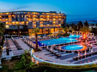 На 70 км. от летището в Анталия и на 10 км. от Манавгат. Стаи Стандартни, фамилни стаи и суити. Стандартните стаи са 23-27 кв. м. и максимален капацитет 2 възрастни и 1 дете. Фамилните стаи се делят на "големи" (27 кв. м.) и "фамилни" (35 кв. м.) Всички имат климатик, минибар, сателитна телевизия, кана за топла вода, сешоар, балкон. Плаж Собствен пясъчен плаж (с малки камъчета), с дължина 200 м. Безплатни чадъри и шезлонги. Ресторант Основен ресторант с отворен бюфет, 3 а ла карт ресторанта - турски, италиански, рибен. Снек бар, лоби бар, бар на басейна, сладкарница, дискотека. Развлечения Външен басейн с водни пързалки, детски вътрешен и външен басейн, вътрешен басейн и джакузи. Дискотека, шоу програми, тематични партита, забавления за деца. Водни спортове, СПА център. |