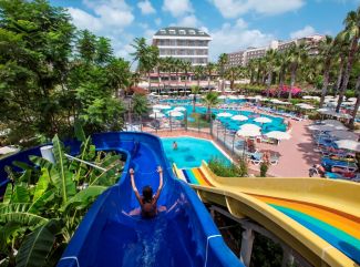 На 60 км. от летището в Анталия и на по-малко от 4 км. от Сиде. Стаи Стаите са разположени в общо 4 сгради - 1 основна и 3 допълнителни. Стандартните стаи в основната сграда са са 23 кв. м. и са с изглед море или страничен изглед море. Фамилните стаи в основната сграда са 26 кв. м. са с едно двойно и две единични легла и имат гледка море или градина (land view). В допълнителните сгради има стандартни стаи (21 кв. м.), фамилни (24 кв. м.), тип фамилни стаи с едно двойно и едно двуетажно легло (23 кв. м.) и апарт стаи - 19 кв. м. Всички разполагат с балкон, телевизор, минибар, сейф. Плаж Собствен пясъчен плаж. Ресторант Основен ресторант, а ла карт ресторанти - италиански, турски, средиземноморски, снек ресторант и бар, бар на басейна, лоби бар, дискотека. Развлечения 3 външни и 1 вътрешен басейн, водни пързалки, детски басейн, дневна и вечерна анимация, СПА, фитнес, детски клуб. |