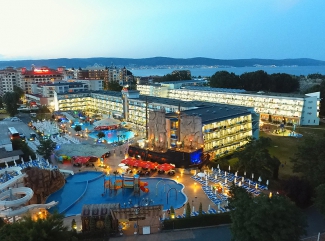 се намира в южната част на Слънчев бряг ( на 3 км от центъра на Слънчев бряг), на 250 м. от плажа и на 800 м. от град Несебър, на около 1.5 км е Старинен град Несебър. Има регулярен транспорт до Слънчев бряг и Несебър – автобус и мини влакче и до Бургас – автобус. Автобусната спирка е на 50м от хотела Хотелът се състои от два корпуса, свързани с обща рецепция с просторно фоайе. Има 4 етажа и асансьори във всяко крило. Разполага с 321 двойни стаи и 150 апартамента. Апартаментите се състоят от две стаи - всекидневна и спалня, със свързваща врата. Всяка стая е оборудвана с баня с душ кабина, балкон, телефон, телевизор, сателитна телевизия и хладилник тип мини бар, термо кана, индивидуален климатик. Бебешка кошара се предоставя при предварителна резервация срещу такса от 8 лв. на ден. Хотелът разполага с голям основен ресторант (All inclusive) и атрактивен а ла карт ресторант (срещу заплащане), лоби бар (срещу заплащане), бар басейн (All inclusive), воден бар (срещу заплащане), лекарски кабинет (срещу заплащане), сейф (срещу заплащане), обмяна на валута, паркинг (срещу заплащане). Описание на стаите: Двойна стая 2+1: Приблизителна площ 24 кв.м . Хотелът разполага с общо 321 двойни стаи с изглед към градината на хотела, басейна или дюните. Максимално настаняване 3 възрастни. Апартамент 2+2: Приблизителна площ 36 кв.м. Хотелът разполага с общо 150 апартамента с разделителна врата между дневна и спалня с изглед към басейна, аквапарк, дюните. Максимално настаняване 3 възрастни и 1 дете. Допуска се настаняване с домашни любимци до 5 кг – безплатно. (Хотелът разполага със шест двойни стаи, подходящи за инвалиди – 2 отделни легла, по – широки входна врата и врата на банята без прагове на пода, вана с помощни дръжки) . Спорт / Забавления: Вътрешните дворове на хотела са приятни както за релакс, така и за забавления. Три открити басейни са на разположение на гостите. Единият е с мини олимпийски размери с детска секция към него с две пързалки, а останалите два са тип мини аква-парк с водни пързалки за деца на различна възраст. Басейните са с различно ниво на дълбочина, подходящо за всички възрасти. Има голяма слънчева тераса с шезлонги и чадъри, които са безплатни за гостите на хотела. Хотелът предлага игрална зала с билярдни маси, тенис на маса, джаги, както и фитнес зала, сауна, масаж (всички са срещу заплащане).