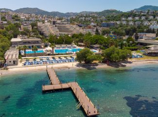 Хотелът се намира на 40 км. от летище Милас, на 20 км. от центъра на Бодрум, в района на Ялъкавак, на брега на морето, в красивия залив Тилкичик. Построен е през 2003 г., с обща площ от 16 000 м2. Последно реновиран през 2019 г, пълна реновация на клубните стаи през 2020г. Стаи: Хотелът разполага общо с 341 стаи, от които 155 стандартни в основния блок, 93 в анекс сграда и 85 клубни. Всички стаи са оборудвани с климатик, телевизор, телефон, баня с душ, сешоар, мини бар (безплатен при пристигане), сейф (платен), балкон (основна сграда и икономични) и френски балкон (анекс сграда). Почистване на стаите - всеки ден, смяна на спалното бельо и кърпите - 3 пъти в седмицата. В хотела: Основен ресторант, 2 а-ла-карт ресторантa (рибен, турски; с предварителна резервация, 01.07 до 15.09, минимален престой 5 нощувки - ;може да се ползва 1 безплатно посещение на а-ла-карт ресторант), 4 бара - снек бар, лоби бар, при басейна и на плажа) дискотека, 2 открити и 1 закрит басейн, водни пързалки, магазин, СПА център, фитнес, козметичен салон, фризьорски салон, паркинг, 24-часова рецепция, мини маркет. Безплатни услуги: Сауна, турска баня, фитнес, билярд, шах, тенис на маса, дартс, анимация, вечерни шоу програми, интернет в общите части. Платени услуги: Масаж, процедури в СПА центъра, фризьор, магазини, курс по гмуркане, моторни водни спортове, шах, химическо чистене и пране, обмяна на валута. За децата: 2 открити и 1 закрит детски басейн, водни пързалки, детска площадка, мини клуб (4-12г.), детегледачка с/у заплащане. Хранене: All Inclusive - закуска, обяд, вечеря и междинни хранения на шведска маса; алкохолни и безалкохолни напитки местно производство без лимит. Плаж: Собствен, пясъчен, платформа, със сертификат "Син флаг". Чадъри и шезлонги на плажа и при басейна - безплатно, плажни кърпи - срещу депозит. |