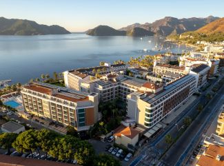 Хотелът се намира на 120 км. от летище Милас, на 99км от летище Даламан, на 3 км. от центъра на Мармарис, на брега на морето. Построен през 1995 г. (блок „А“) и 1998 г. (блок „Б“) с обща площ от 9 000 м2, последно реновиран през 2009 г. (блок „А“) и 2013 г. (блок „Б“). Стаи: Хотелът разполага общо с 426 стаи, от които 99 в блок „А“ и 327 в блок „Б“. Всички стаи са оборудвани с климатик, телевизор, телефон, баня с душ/вана, сешоар, мини бар (платен), сейф (платен), балкон. Почистване на стаите - всеки ден, смяна са бельото и кърпите - 3 пъти в седмицата. В хотела: Основен ресторант, 4 бара, дискотека, 2 открити и 1 закрит басейн, водни пързалки, магазини, СПА център, паркинг. За децата: 2 детски басейна, водни пързалки, детска площадка. Безплатни услуги: Сауна, турска баня, фитнес, аеробика, тенис на маса, анимация, WI-FI интернет в лоби. Платени услуги: СПА център, масаж, пилинг, фризьор, детегледачка, магазини, пералня, химическо чистене, лекар, интернет кафе, билярд, моторни водни спортове. ПЛАЖ: Собствен, пясъчен – чадъри и шезлонги на плажа и при басейна – безплатно, плажни кърпи - безплатно. Хранене: All Inclusive – закуска, обяд, вечеря и междинни хранения на шведска маса; алкохолни и безалкохолни напитки местно производство без лимит.  |