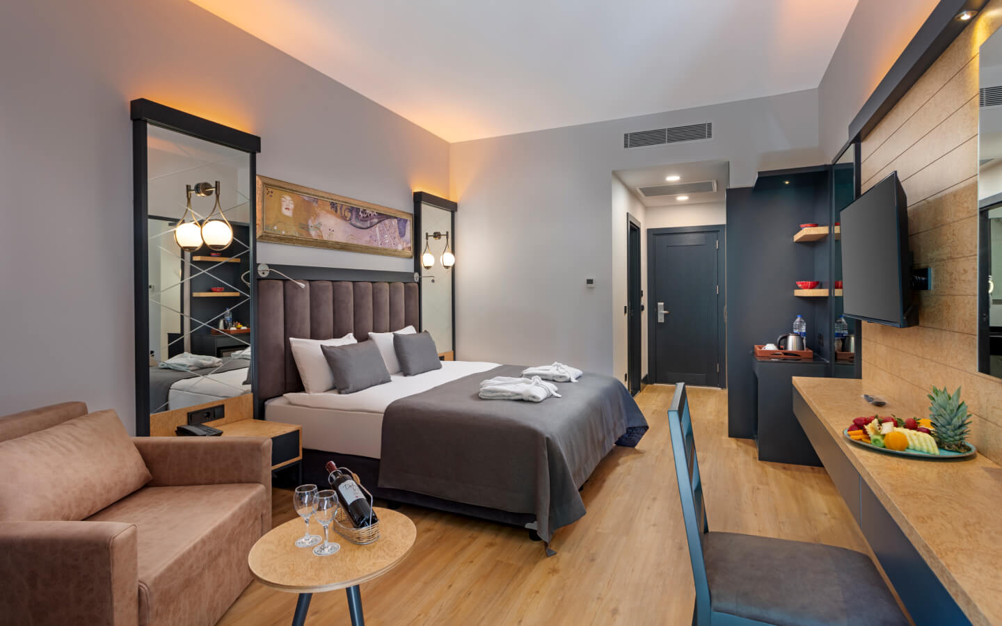 Хотелът се намира на 55 км. от летище Анталия, на 63 км. от центъра на Анталия, в района на гр.Сиде. Построен през 2004 г. с обща площ от 32 000 м2., последно реновиран през 2014 г. Стаи: Хотелът разполага с общо 328 стаи, от които 262 стандартни стаи, 64 фамилни стаи и 2 кралски апартамента. Всички стаи са оборудвани с: централен климатик, сателитна телевизия, телефон, безжичен интернет, баня с вана, сешоар, мини бар – зарежда се ежедневно с вода, безалкохолни и бира, сейф, балкон. Почистване на стаите и смяна на кърпите – всеки ден, смяна на бельото – 3 пъти в седмицата. В хотела: Основен ресторант, 3 а’ла карт ресторанта (платени с предварителна резервация) – италианки, турски и рибен, 3 снек ресторанта, 5 бара (eдин от които е 24 часа, в Center point бар се сервират Starbucks напитки, 5 открити и 2 закрити басейна, водни пързалки, магазини, амфитеатър, Спа център, 4 конферентни зали. За децата: Детско меню, детска площадка, мини клуб (4-12г.), мини диско, интерактивен детски басейн с водни пързалки, анимация. Безплатни услуги: wi-fi ( общи части ), турска баня, сауна, фитнес, дартс, тенис на маса, тенис корт - (осветление и екипировка), фугбол, баскетбол, плажен волейбол, аеробика, зумба, йога, денс аеробика, пилатес, мини голф, TV стая, кино, бебешко столче, детско и бебешко меню в основния ресторант. Платени услуги: басейн с морска вода, масаж, център за красота, магазини, билярд, боулинг, интернет кафе, химическо чистене, лекар, детегледачка, бебешка количка, водни спортове, Play station и игрални машини. Хранене: ULTRA ALL INCLUSIVE - закуска, обяд и вечеря на шведска маса, междинни хранения, алкохолни и безалкохолни напитки - без лимит (съгласно концепцията на хотела). Плаж: ПЛАЖ: Собствен, пясъчен на 100 м. от хотела и пирс. Бар на плажа. Чадъри, шезлонги и матраци на плажа и при басейна – безплатно, плажни кърпи – безплатно. Хотелът има право да прави промени в концепцията, без да уведомява предварително туроператора за наложените промени. |