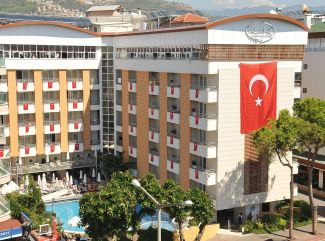 Намира се на 120 км от летище Анталия, на 130 км от центъра на Анталия, на 1 км от центъра на Алания, на 100 м от брега на морето. Построен през 1987 г., на обща площ от 1.700 м2. Реновиран 2013 г. Стаи: Хотелът разполага с общо 107 стаи, разположени в една основна сграда, от които 85 Standard room (16 м2), Child friendly стаи (в тях две деца се настаняват безплатно – 16 м2), 20 Connected room (2 стаи, 1 спалня и 2 единични легла, баня - 32 м2), 2 Honeymoon room (за младоженция, халати/чехли, кошница с вино и плодове - 16 м2). Всички стаи са оборудвани с климатик, телевизор, телефон, баня с душ/вана, сешоар, минибар (вода, сок, сода - само при пристигане), сейф (срещу заплащане). Почистване на стаите и смяна на кърпите - всеки ден, смяна на спалното бельо - 2 пъти в седмицата. В хотела: Основен ресторант, 3 бара, открит и закрит басейн, СПА център, магазини. Безплатни услуги: Фитнес, джакузи, лека анимация (в активен сезон), Wi-Fi (в лоби). Платени услуги: Сауна, турска баня, парна баня, масаж, пилинг, фризьор, лекар, билярд, водни спортове, турско кафе, фреш сок, сладолед, химическо чистене, рент-а кар. Хранене: All Inclusive - закуска, обяд и вечеря на шведска маса, междинни хранения, местни алкохолни и безалкохолни напитки - без лимит (съгласно концепцията на хотела). Плаж: Градски, пясъчно-чакълест. Чадъри и шезлонги при басейна – безплатно, на плажа – срещу заплащане. Хотелът има право да прави промени в концепцията, без да уведомява предварително туроператора за наложените промени. |